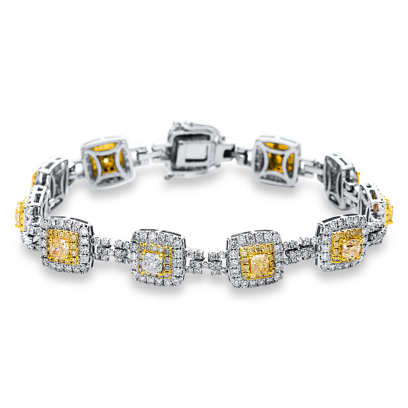 Armband 18 kt WG+GG, 341 Brillanten 3,51 ct, TW-si, 11 Cushion 3,09 ct, gelb, 154 Brillanten 1,02 ct, gelb, L:18,0 cm