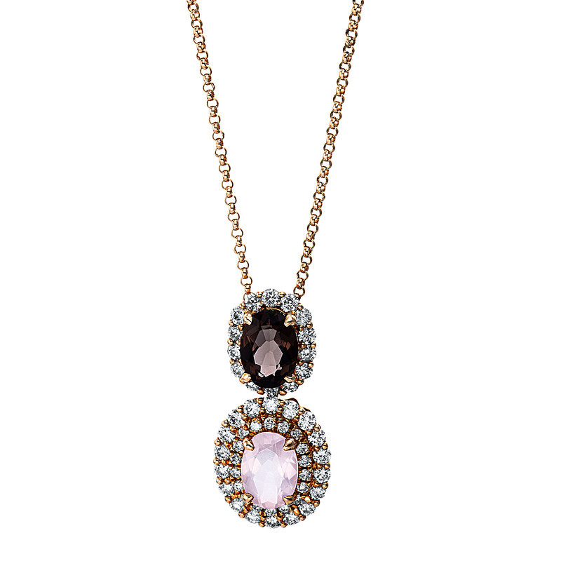 Collier 18 kt RG, 50 Brillanten 0,66 ct, TW-pi, 1 Rosenquarz 0,73 ct, 1 Rauchquarz 0,75 ct, L:45,0 cm