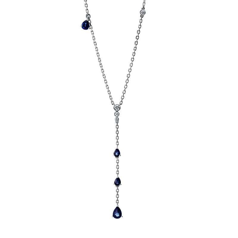 Collier 18 kt WG, 4 Brillanten 0,12 ct, TW-si, 3 Saphire 0,57 ct blau, 1 Saphir 0,50 ct blau, L:43,2 cm