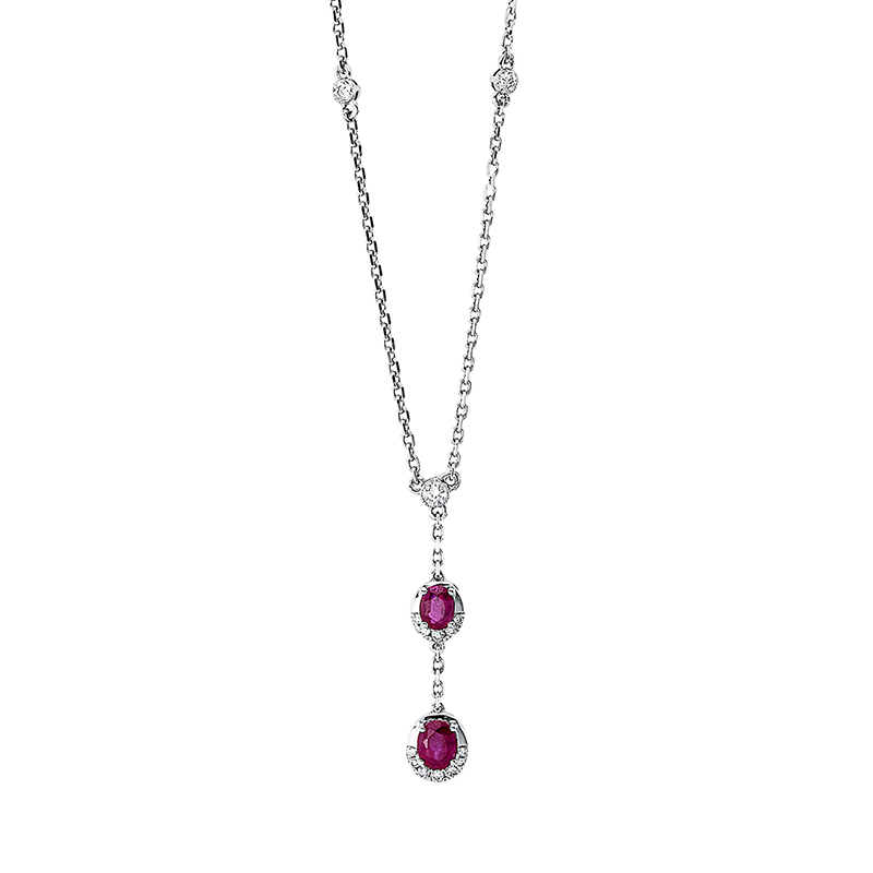 Collier 18 kt WG, 1 Brill. 0,05 ct, W-pi, 14 Brillanten 0,15 ct, W-pi, 2 Rubine 0,65 ct rot, L:43,2 cm