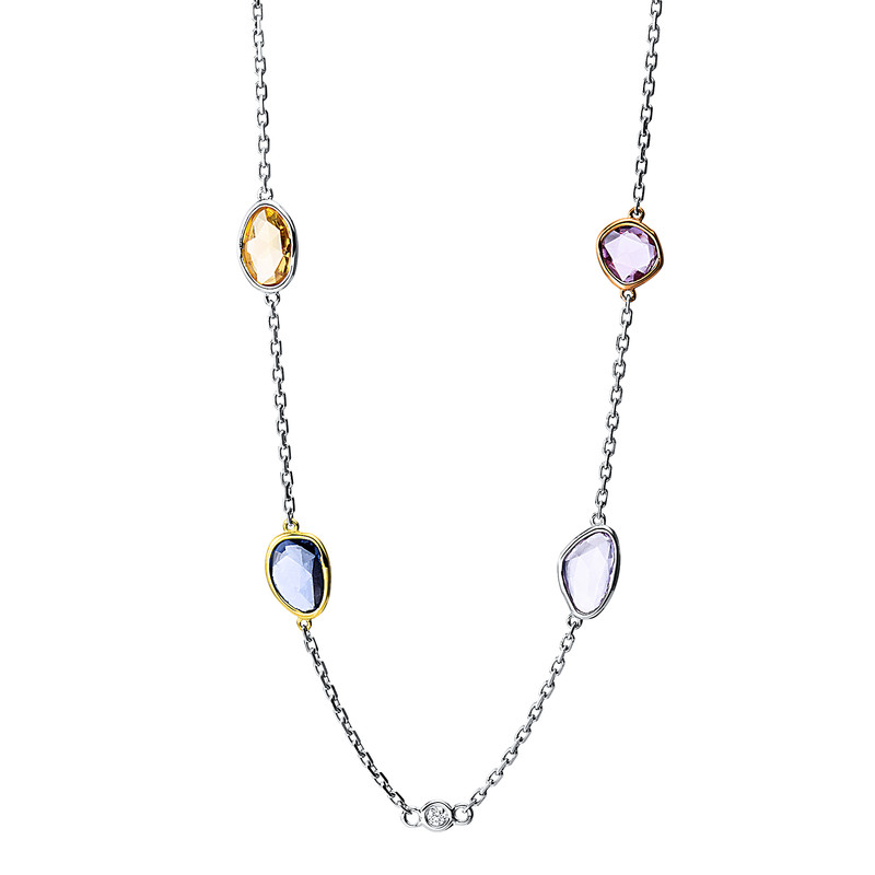 Collier 18 kt WG+GG+RG, 4 Brillanten 0,09 ct, TW-si, 10 Saphire 8,46 ct multicolor, L:45,7 cm