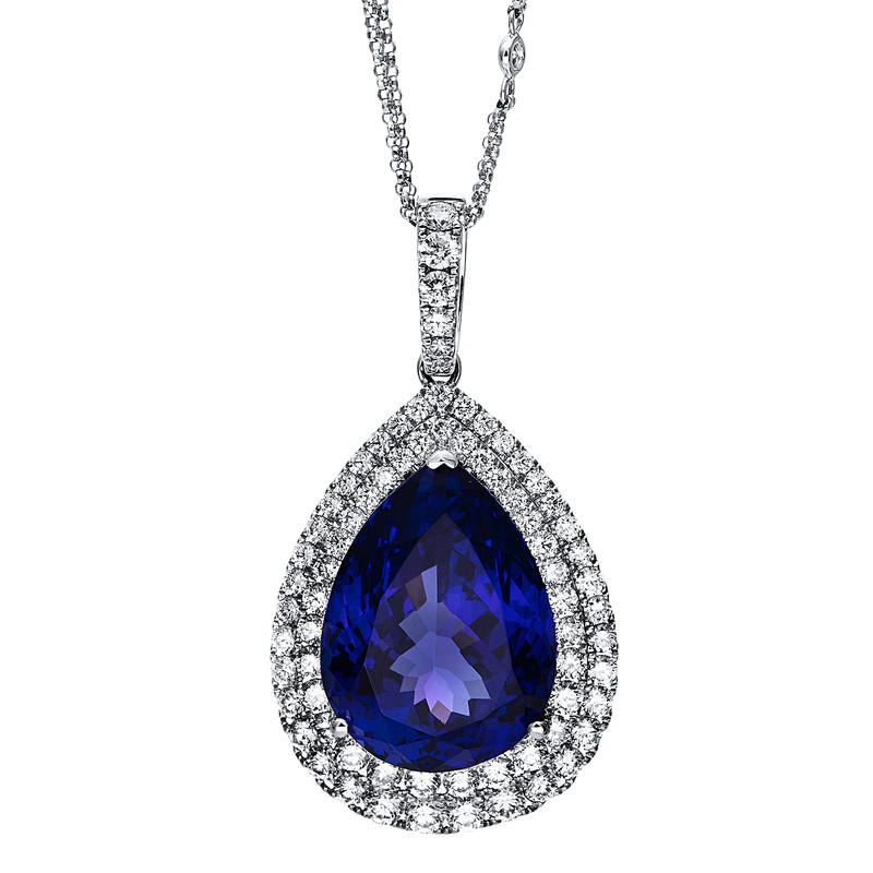 Collier 3er-Krappe 18 kt WG, 74 Brillanten 2,32 ct, TW-si, 1 Tansanit 27,05 ct blau, H:42,4 mm, B:22,9 mm, L:45,0 cm