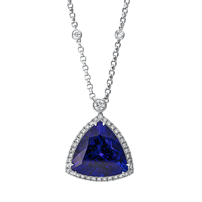 Collier 3er-Krappe 18 kt WG, AGL 1104429, 1 Brill. 0,31 ct, TW-si, 44 Brillanten 1,83 ct, TW-si, 1 Tansanit 43,95 ct blau, L:45,7 cm