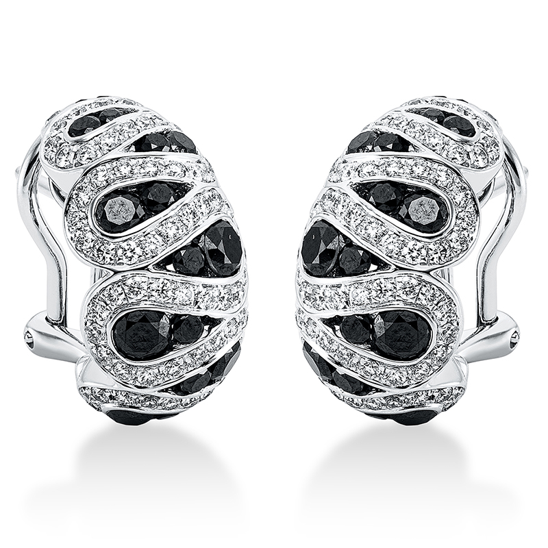 Creolen 18 kt WG, Fassung teils schwarz rhodinie, 136 Brillanten 1,05 ct, TW-vsi/si, 36 Brillanten 2,03 ct, schwarz