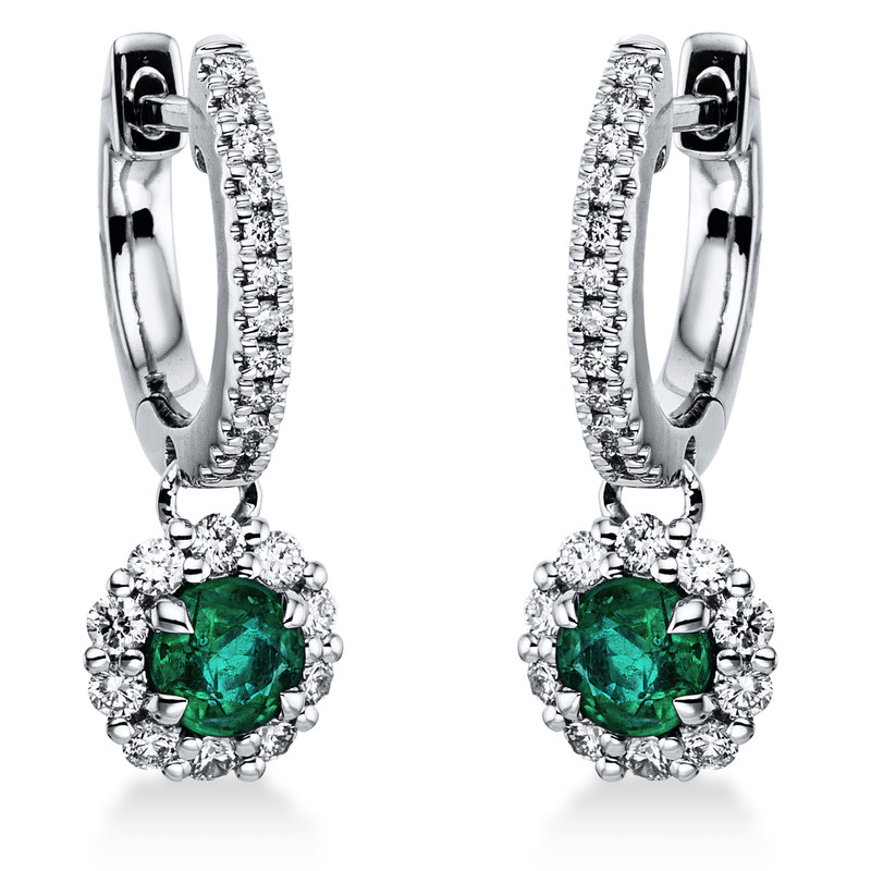 Creolen 4er-Krappe 18 kt WG, 44 Brillanten 0,32 ct, TW-si, 2 Smaragde 0,45 ct grün, H:18,5 mm, B:6,6 mm