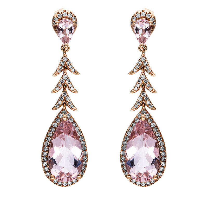 Ohrschmuck 14 kt RG “Tropfen”, 124 Brillanten 0,66 ct, TW-si, 2 Morganit 7,07 ct rosé, 2 Morganit 0,68 ct rosé