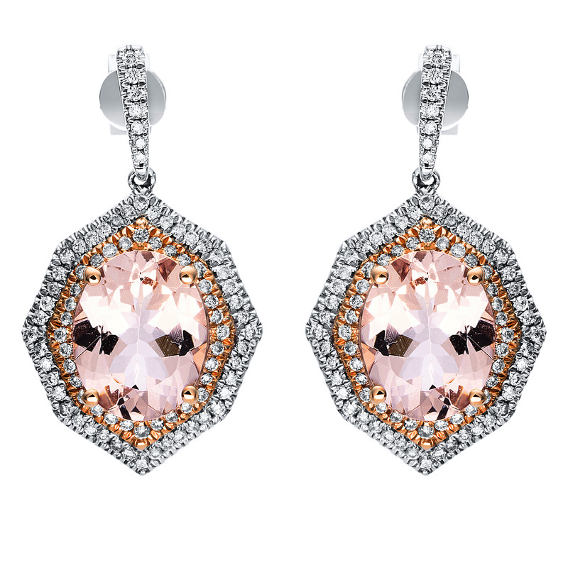 Ohrschmuck 14 kt WG+RG, 166 Brillanten 0,49 ct, TW-si, 2 Morganit 4,29 ct rosé