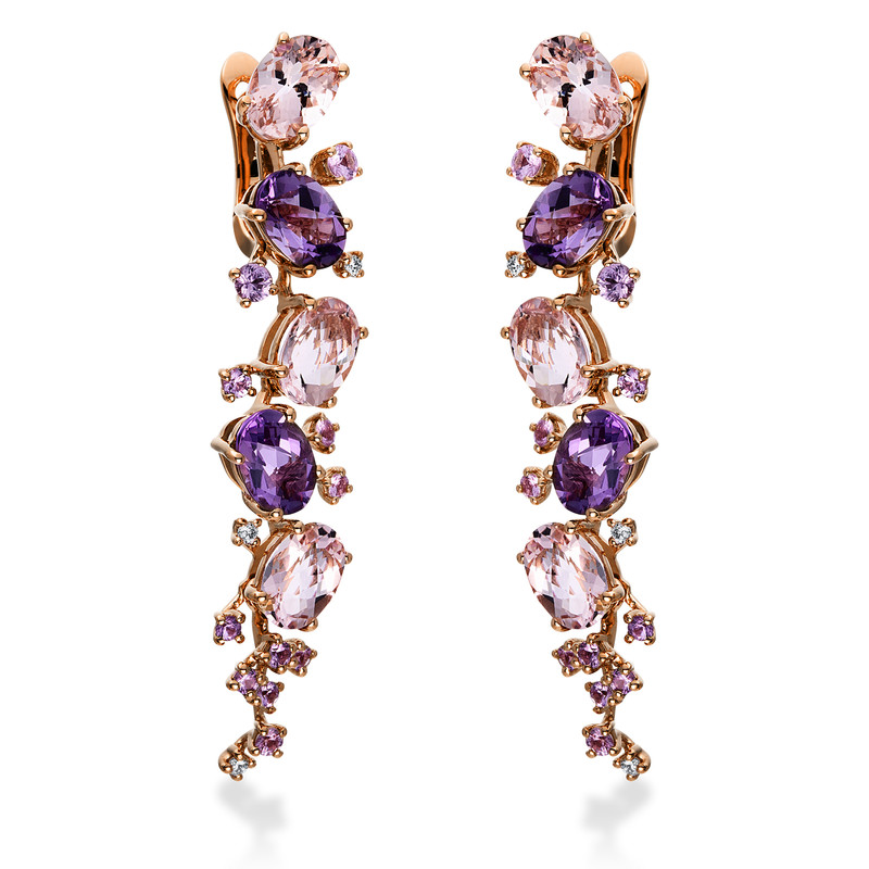 Ohrschmuck 18 kt RG, 6 Brillanten 0,08 ct, TW-si, 4 Amethyste 2,50 ct pink, 22 Saphire 0,78 ct pink, 6 Morganit 4,75 ct rosé, H:45,5 mm, B:9,9 mm