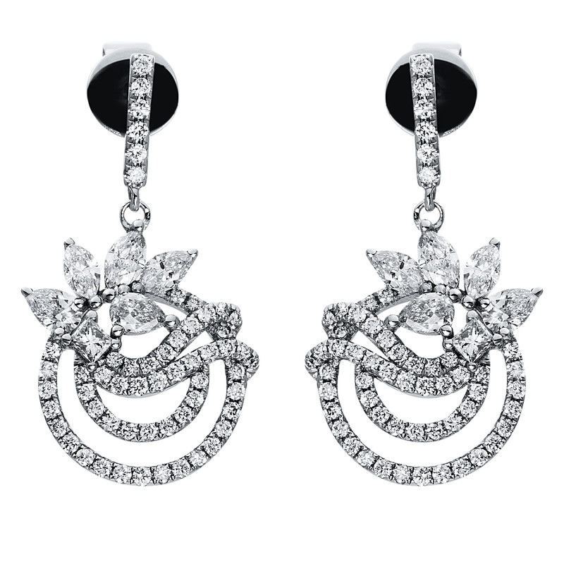 Ohrschmuck 18 kt WG, 6 Navette 0,25 ct, TW-si, 2 Princ. 0,06 ct, TW-si, 4 Tropfen 0,19 ct, TW-si, 112 Brillanten 0,33 ct, TW-si, H:23,2 mm, B:11,2 mm