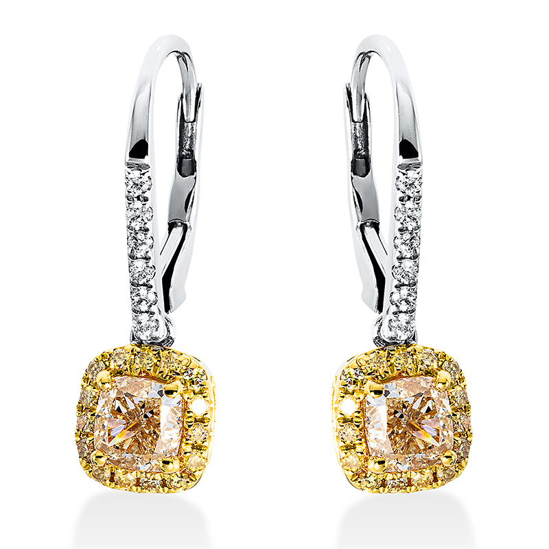 Ohrschmuck 18 kt WG+GG, 12 Brillanten 0,09 ct, TW-si, 2 Cushion 1,59 ct, gelb, 30 Brillanten 0,15 ct, gelb, H:22,9 mm, B:7,0 mm