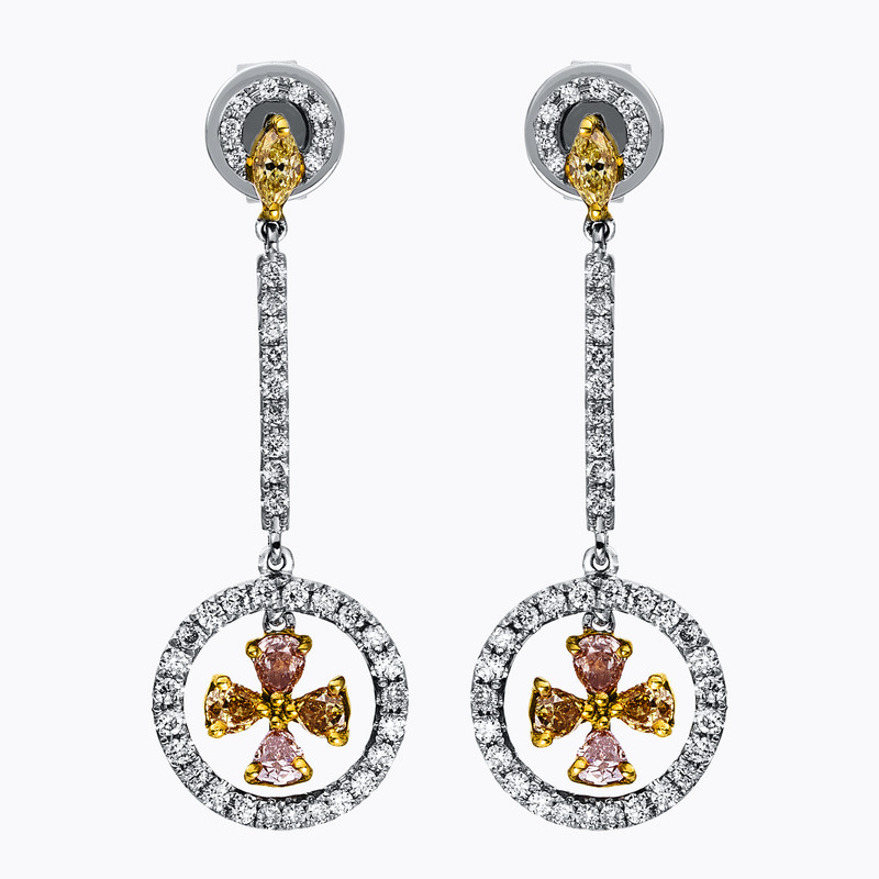 Ohrschmuck 18 kt WG+GG+RG, 10 Tropfen 0,84 ct, fancy-si, 82 Brillanten 0,55 ct, TW-si