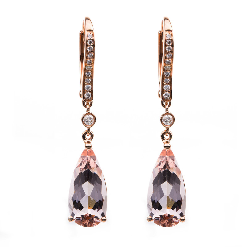 Ohrschmuck 3er-Krappe 18 kt RG, 22 Brillanten 0,19 ct, TW-si, 2 Morganit 8,97 ct rosé