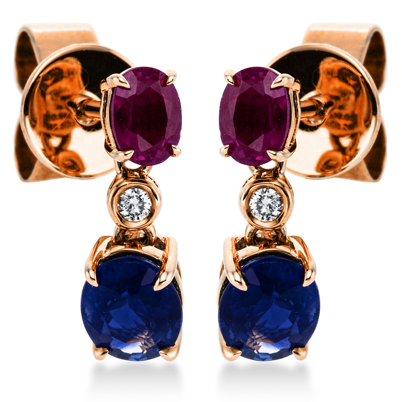 Ohrstecker 18 kt RG, 2 Brillanten 0,03 ct, W-pi, 2 Rubine 0,48 ct rot, 2 Saphire 1,06 ct blau