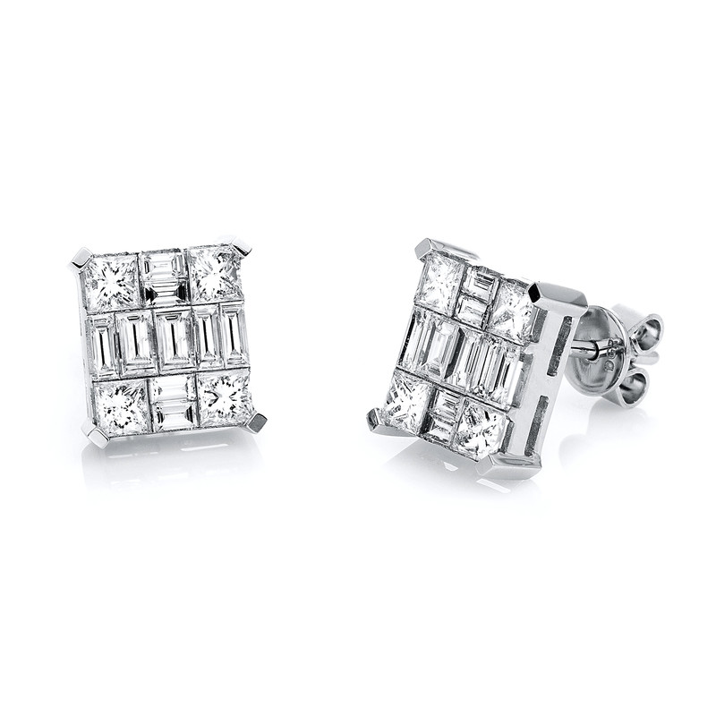 Ohrstecker 18 kt WG, 8 Princ. 0,80 ct, TW-si, 18 Baguette 0,72 ct, TW-si, H:8,7 mm, B:7,6 mm