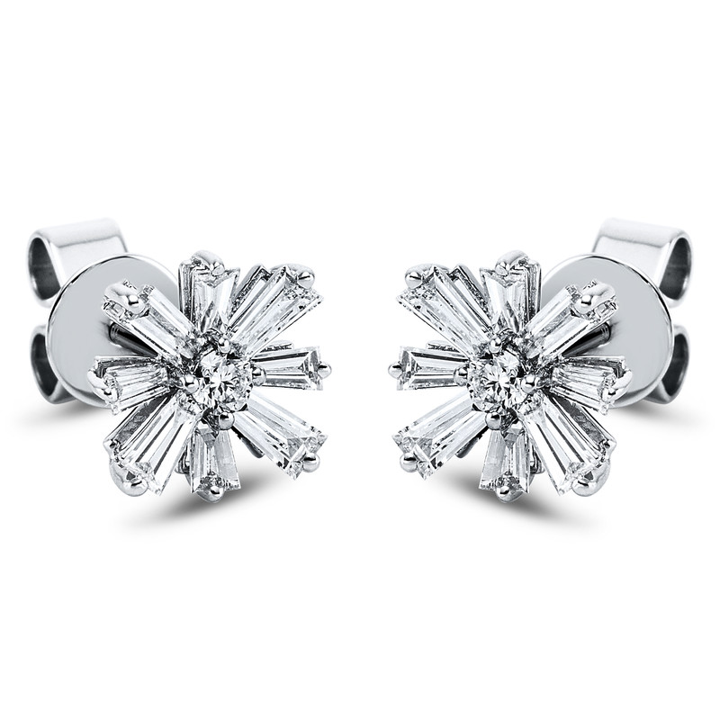 Ohrstecker 18 kt WG, 2 Brillanten 0,23 ct, TW-si, 16 Trapeze 0,59 ct, TW-si, 8 Brillanten 0,12 ct, TW-si, H:8,5 mm, B:8,5 mm