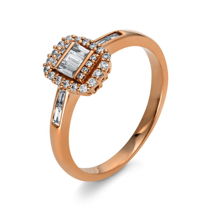 Ring 14 kt RG, 7 Baguette 0,16 ct, TW-si, 26 Brillanten 0,14 ct, TW-si, Weite:53,5