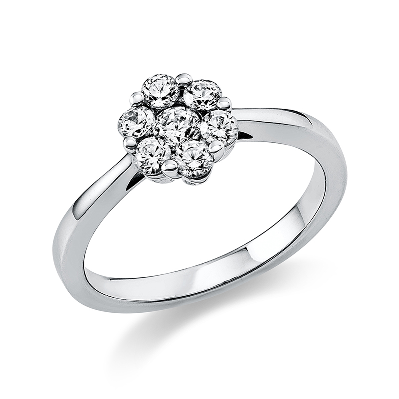 Ring 14 kt WG, 1 Brill. 0,14 ct, TW-si, 6 Brillanten 0,39 ct, TW-si, B:7,6 mm, Ø:7,6 mm, Weite:50