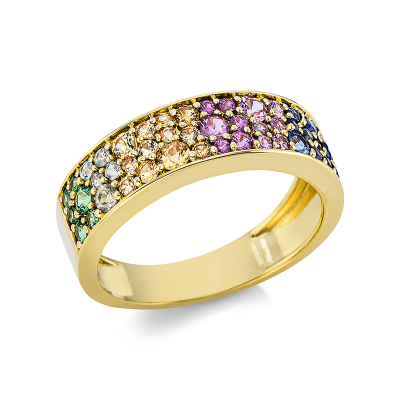 Ring 18 kt GG, 5 Saphire 0,11 ct grün, 14 Saphire 0,31 ct blau, 12 Saphire 0,27 ct gelb, Weite:54
