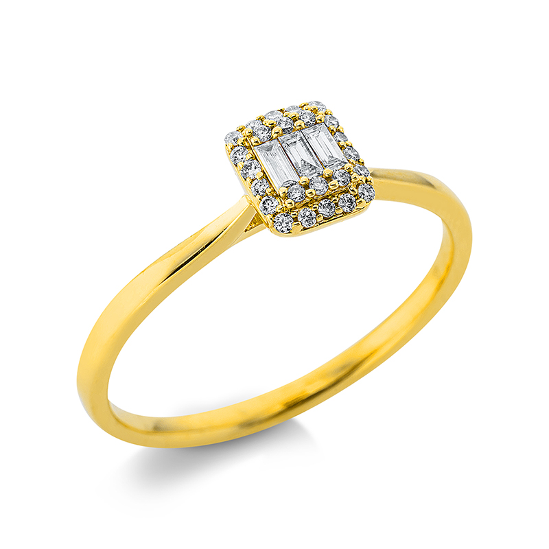Ring 18 kt GG, 3 Baguette 0,06 ct, TW-si, 24 Brillanten 0,07 ct, TW-si, Weite:54