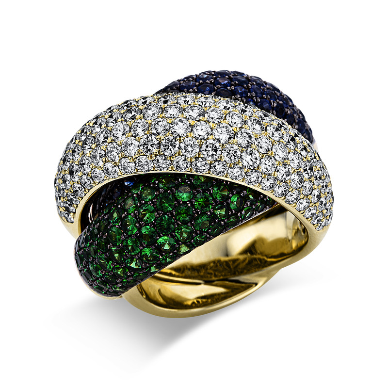 Ring 18 kt GG+WG, Fassung teils schwarz rhodinie, 134 Brillanten 3,31 ct, TW-vsi, 75 Granat 2,21 ct grün, 67 Saphire 1,97 ct blau, Weite:54