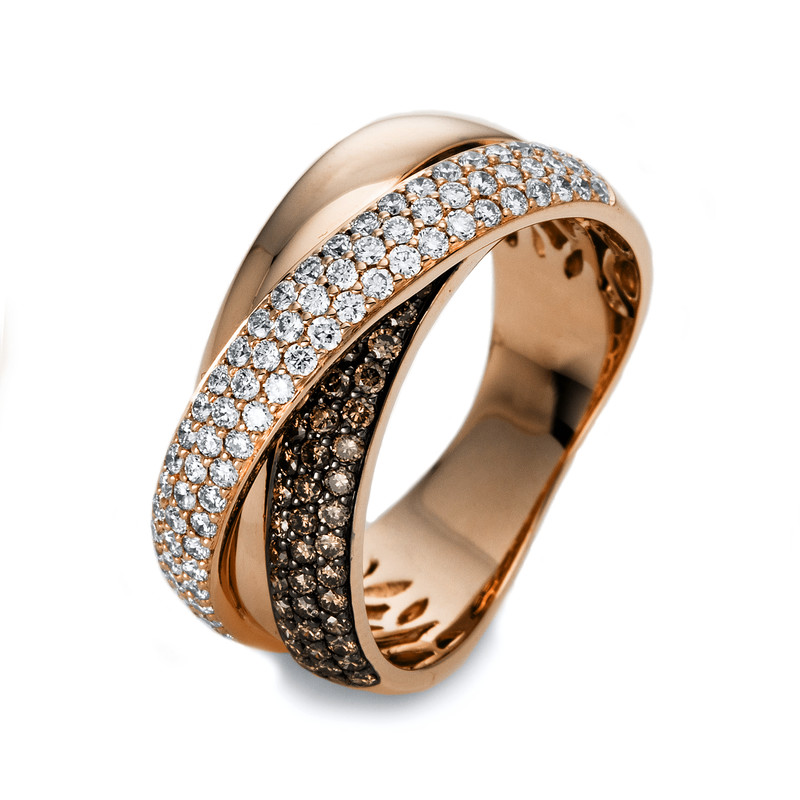 Ring 18 kt RG, 76 Brillanten 0,56 ct, W-si, 46 Brillanten 0,40 ct, braun, B:9,1 mm, Weite:54