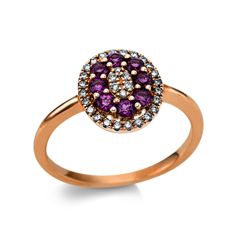 Ring 18 kt RG, 30 Brillanten 0,18 ct, TW-si, 8 Rhodolith 0,54 ct rot, H:10,1 mm, B:11,5 mm, Weite:54