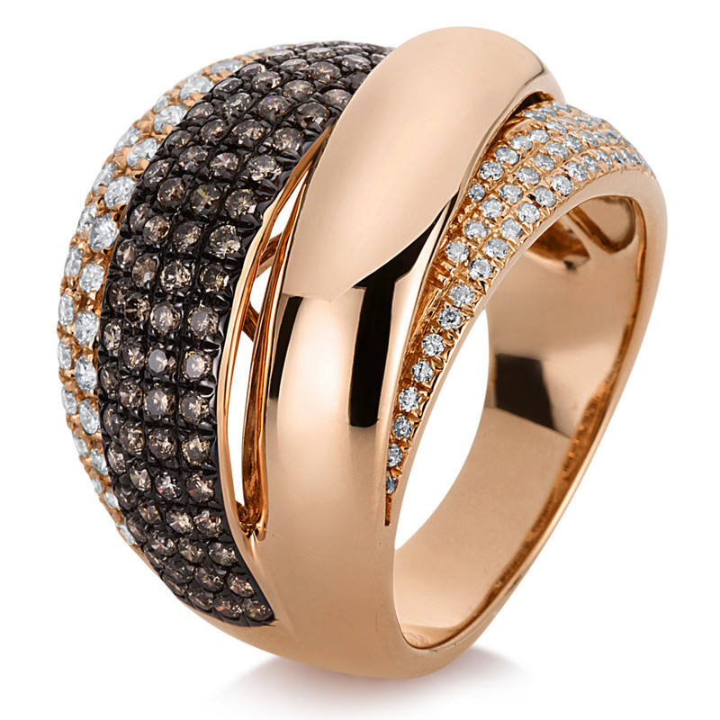 Ring 18 kt RG, teils schwarz rhodiniert, 118 Brillanten 0,84 ct, TW-si, 85 Brillanten 0,83 ct, braun, Weite:54