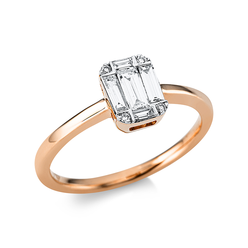 Ring 18 kt RG+WG, 5 Baguette 0,33 ct, TW-si, 4 Brillanten 0,03 ct, TW-si, H:7,6 mm, B:5,9 mm, S:4,0 mm, Weite:54