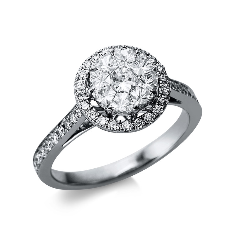 Ring 18 kt WG, 18 Brillanten 0,19 ct, F-vsi, 9 Fant-Schl. 0,62 ct, F-vsi, 22 Brillanten 0,18 ct, F-vsi, Weite:54