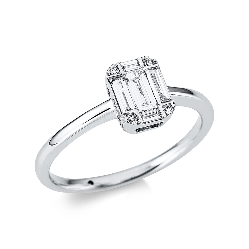 Ring 18 kt WG, 5 Baguette 0,34 ct, TW-si, 4 Brillanten 0,02 ct, TW-si, H:7,6 mm, Weite:54