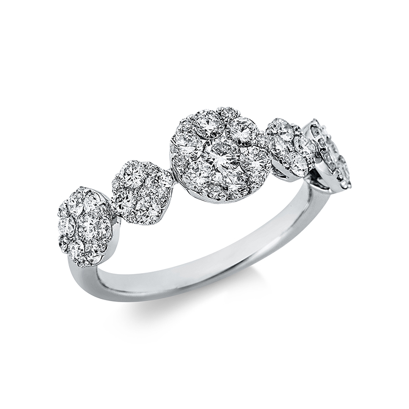 Ring 18 kt WG, 6 Brillanten 0,33 ct, W-pi, 1 Brill. 0,09 ct, W-pi, 50 Brillanten 0,79 ct, W-pi, Weite:53
