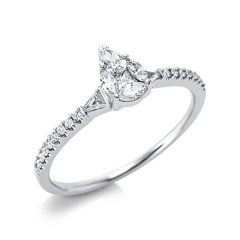 Ring 18 kt WG, 16 Brillanten 0,09 ct, TW-vsi, 1 Princ. 0,04 ct, TW-vsi, 3 Navette 0,11 ct, TW-vsi, 1 Tropfen 0,09 ct, TW-vsi, 2 Baguette 0,04 ct, TW-vsi, Weite:54