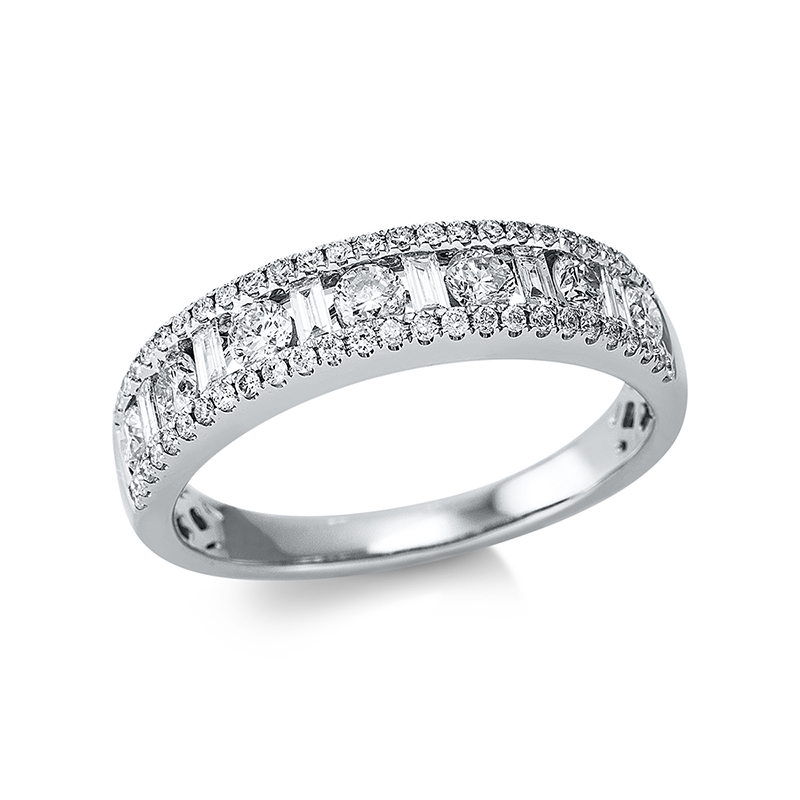 Ring 18 kt WG, 6 Baguette 0,15 ct, TW-si, 59 Brillanten 0,60 ct, TW-si, Weite:54