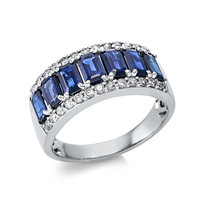Ring 18 kt WG, 26 Brillanten 0,32 ct, TW-si, 7 Saphire 2,31 ct blau, Weite:54