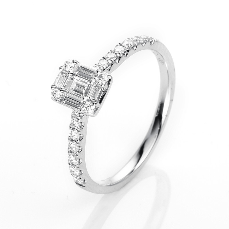 Ring 18 kt WG, 4 Trapeze 0,15 ct, TW-vsi, 1 Bag. 0,11 ct, TW-vsi, 18 Brillanten 0,25 ct, TW-si, Weite:53