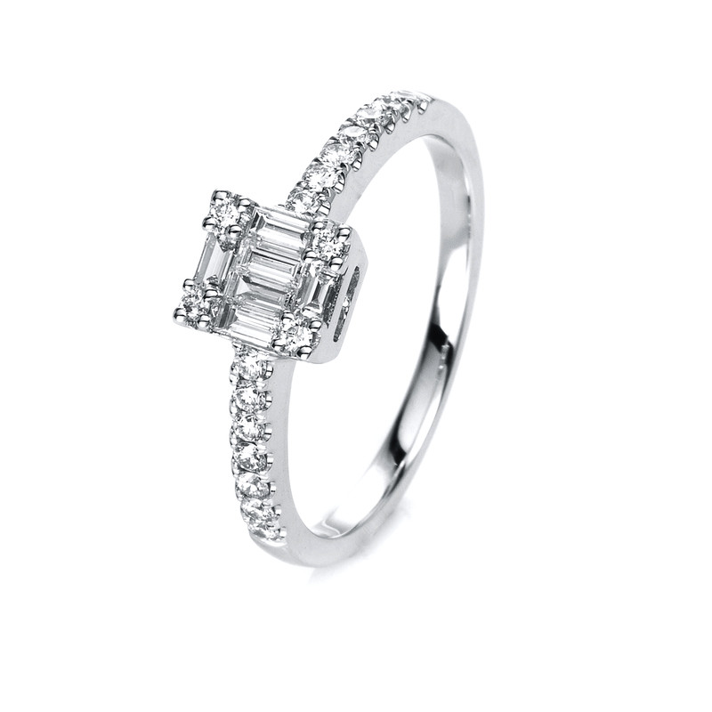 Ring 18 kt WG, 6 Baguette 0,17 ct, TW-si, 18 Brillanten 0,23 ct, TW-si, Weite:54