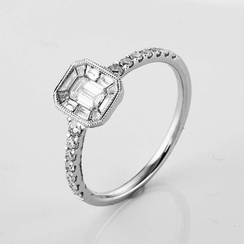 Ring 18 kt WG, 11 Baguette 0,50 ct, TW-si, 14 Brillanten 0,26 ct, TW-si, Weite:54