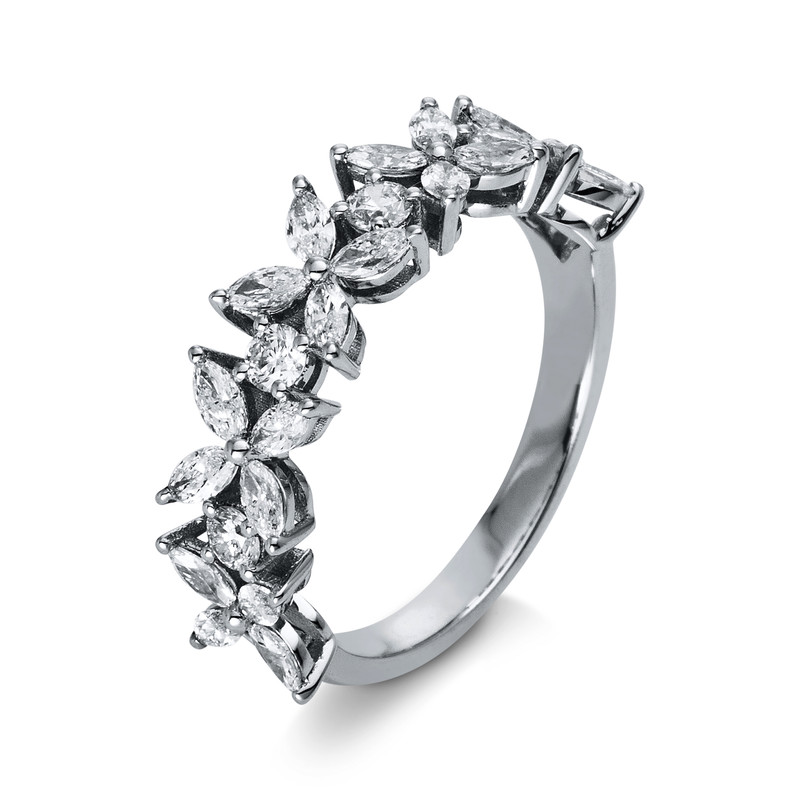 Ring 18 kt WG, 20 Navette 0,89 ct, TW-si, 4 Brillanten 0,24 ct, TW-si, Weite:54
