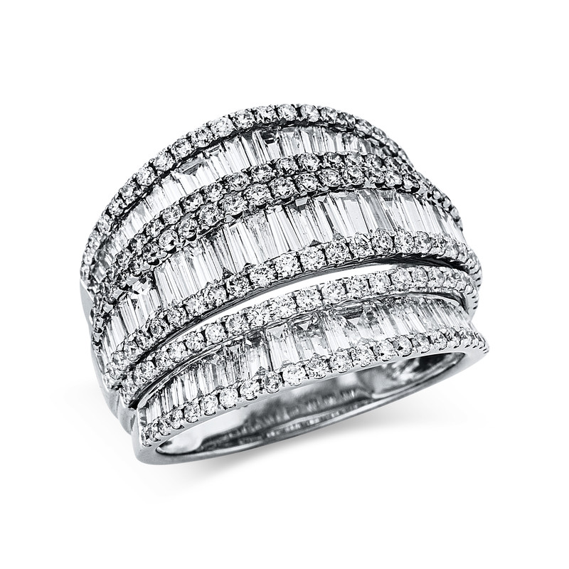 Ring 18 kt WG, 72 Baguette 1,66 ct, TW-si, 144 Brillanten 1,08 ct, TW-si, B:17,4 mm, Weite:54