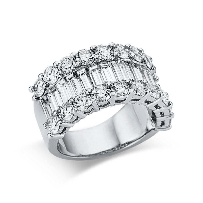 Ring 18 kt WG, 14 Trapeze 2,35 ct, TW-vsi, 20 Brillanten 2,62 ct, TW-vsi, B:11,1 mm, Weite:53