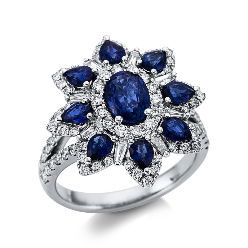 Ring 18 kt WG, 8 Trapeze 0,24 ct, TW-si, 82 Brillanten 0,81 ct, TW-si, 9 Saphire 2,45 ct blau, Weite:54