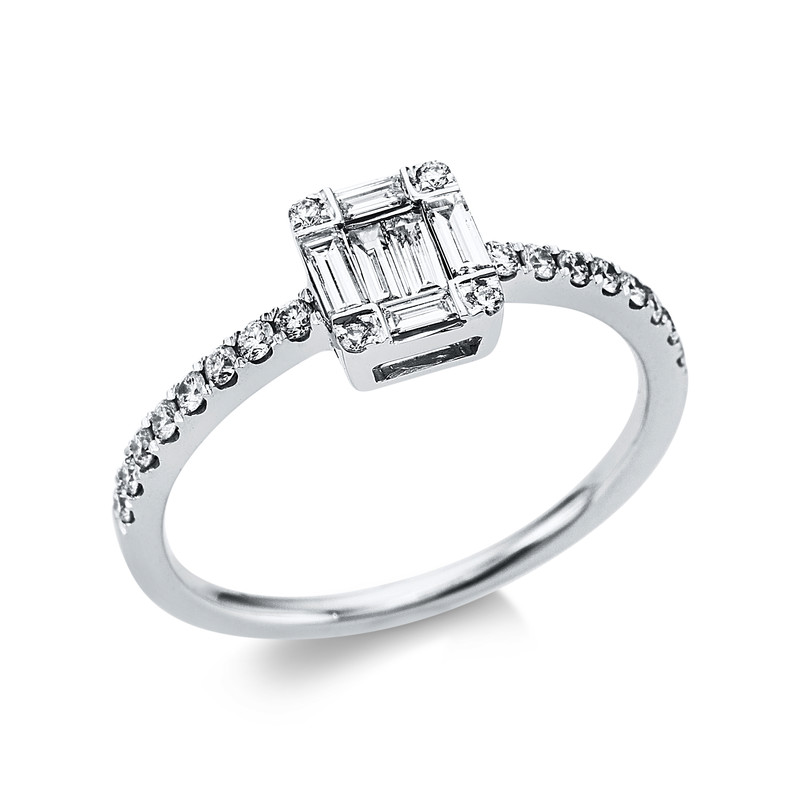 Ring 18 kt WG, 6 Baguette 0,24 ct, TW-si, 20 Brillanten 0,22 ct, TW-si, H:6,8 mm, B:6,0 mm, S:1,3 mm, Weite:54