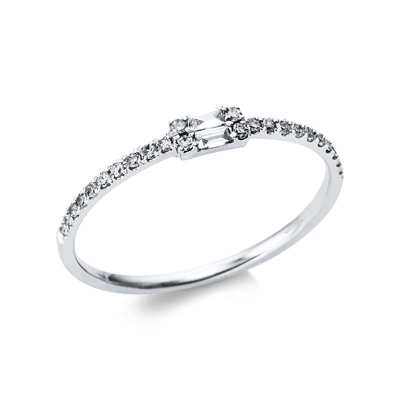 Ring 18 kt WG, 2 Baguette 0,03 ct, TW-si, 24 Brillanten 0,10 ct, TW-si, H:4,6 mm, B:2,4 mm, Weite:55