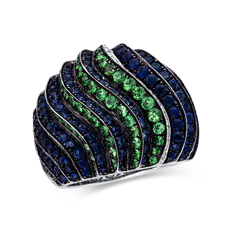Ring 18 kt WG, Fassung teils schwarz rhodinie, 75 Brillanten 1,69 ct, TW-vsi/si, 75 Tsavorith 2,01 ct grün, 148 Saphire 3,55 ct blau, Weite:54