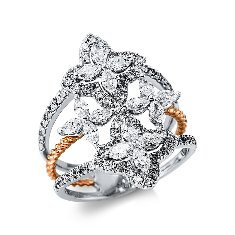 Ring 18 kt WG+RG, 16 Navette 0,87 ct, TW-si, 72 Brillanten 0,58 ct, TW-si, Weite:53
