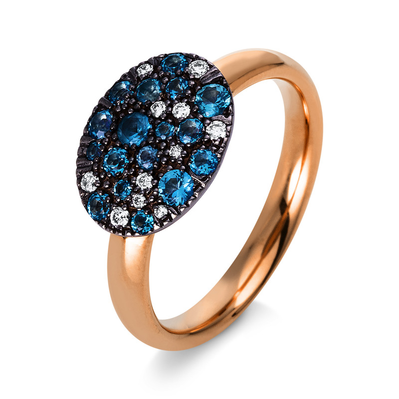 Ring 18 kt WG+RG, 11 Brillanten 0,08 ct, TW-si, 17 Blautopase 0,48 ct blau, H:12,2 mm, B:9,5 mm, S:3,0 mm, Weite:53