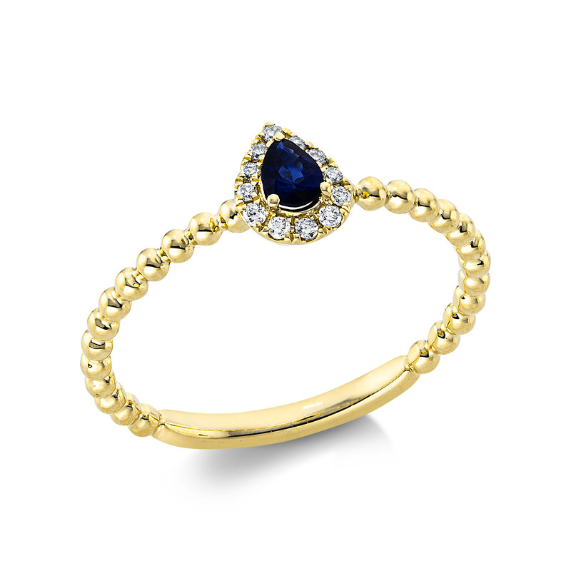 Ring 3er-Krappe 18 kt GG “Tropfen”, 12 Brillanten 0,06 ct, TW-si, 1 Saphir 0,20 ct blau, H:5,2 mm, B:6,6 mm, Weite:53