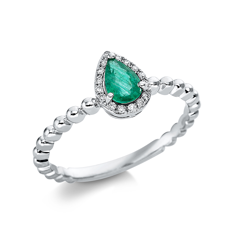 Ring 3er-Krappe 18 kt WG “Tropfen”, 16 Brillanten 0,07 ct, TW-si, 1 Smaragd 0,35 ct grün, Weite:54