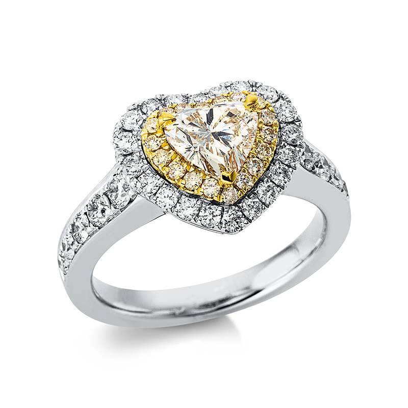 Ring 3er-Krappe 18 kt WG+GG “Herz”, 30 Brillanten 0,88 ct, TW-si, 1 Herzschl. 1,02 ct, gelb, 18 Brillanten 0,17 ct, gelb, Weite:54