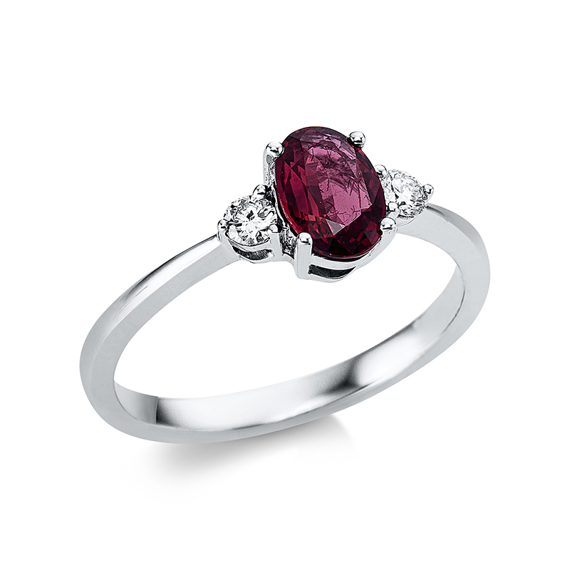 Ring 4er-Krappe 18 kt WG, 2 Brillanten 0,10 ct, TW-vsi, 1 Rubin 0,53 ct rot, Weite:53